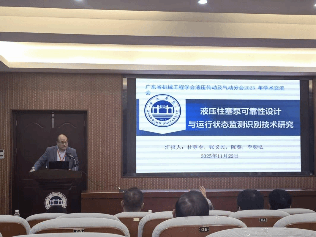 开幕式上,广州嘉泰液压机电有限公司总经理方伟松、分会理事长丁问司分别致辞,童伟秘书长介绍了会议筹备情况。学术报告环节由丁问司理事长主持,共安排了7场高质量学术报告。tyc7111cc太阳成集团杜尊令老师作了"液压柱塞泵可靠性设计与运行状态监测识别技术研究"的主题报告,分享了我校在液压系统可靠性领域的最新研究成果。其他报告同样精彩纷呈,包括华南理工大学刘亚俊教授的"基于深度学习的液压桩锤代理模型研究"、广东工业大学邹大鹏教授的"冷冻电镜送样系统真空度的测控技术研究"等,内容涵盖AI驱动、数字化转型、机理与数据融合等行业前沿话题。